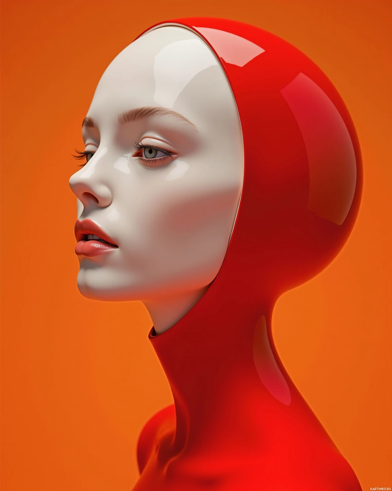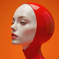 facial expression is neutral, with her eyes cast downward. Her skin tone is fair, and her hair is not visible due to the head covering. The overall atmosphere of the image suggests that it may be used for advertising or editorial purposes, possibly to convey