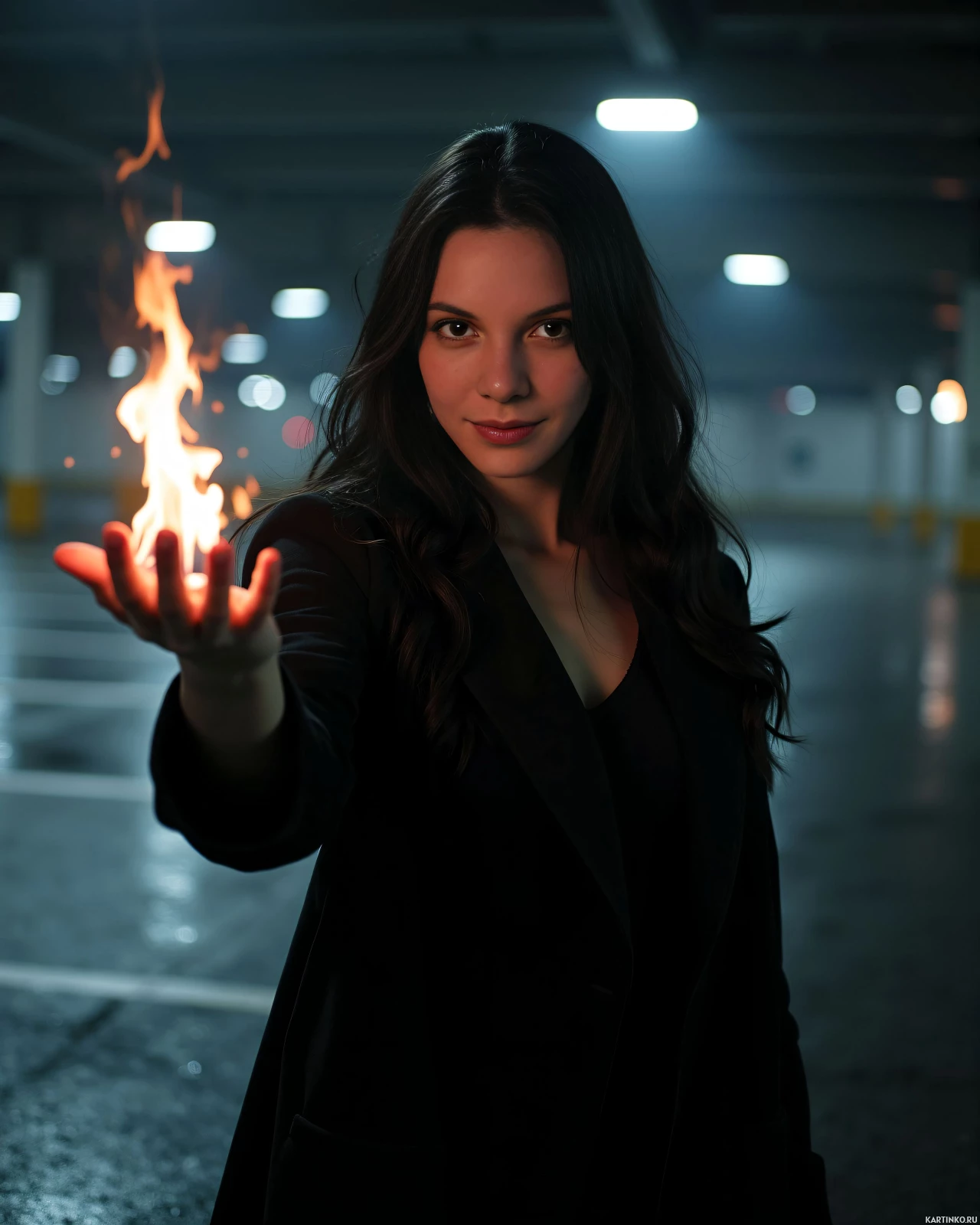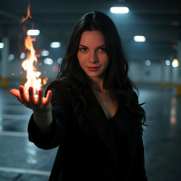 a small flame is emanating from the tips of her fingers. The flame appears to be contained within her hand, as if she has some sort of magical or supernatural ability to control fire. The background of the image is dark and blurry, but it appears to be an empty