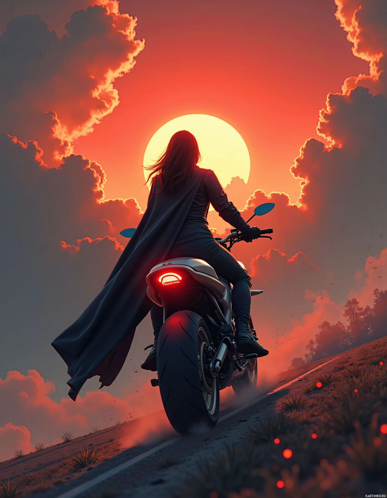 a warm glow over the entire scene. The motorcycle itself appears sleek and modern, with its headlights shining brightly as it speeds along the road. The woman's posture suggests that she is an experienced rider, confident and in control of her vehicle. As the eye moves outward from the central figure, it becomes apparent that the road stretches out into the distance, disappearing over a hill or ridge. Beyond this, the landscape drops away sharply, giving way to rolling hills and fields that stretch off into the distance. The overall effect is one of