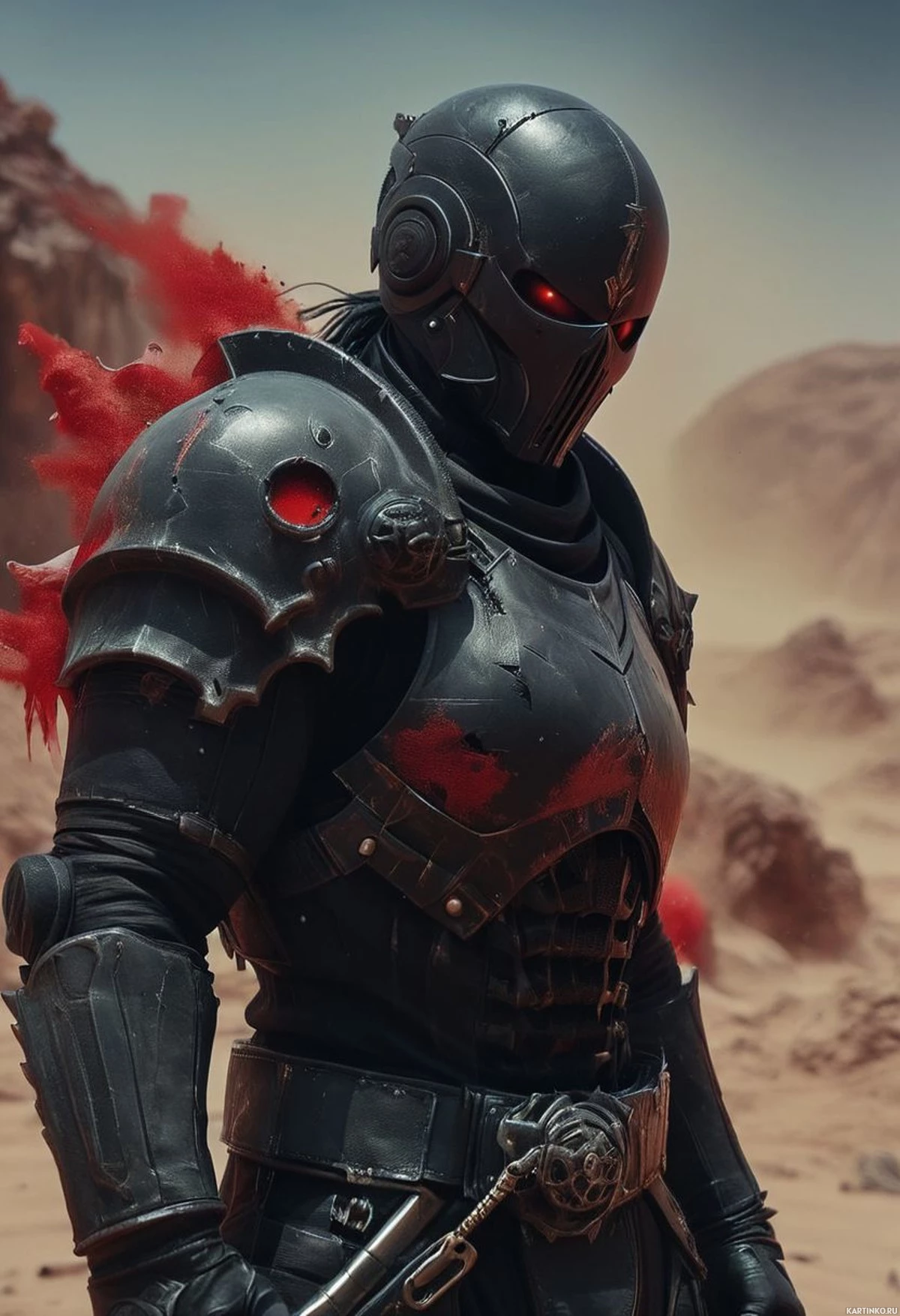 a red flame-like element coming out of the shoulder or back region of the armor. The background depicts