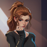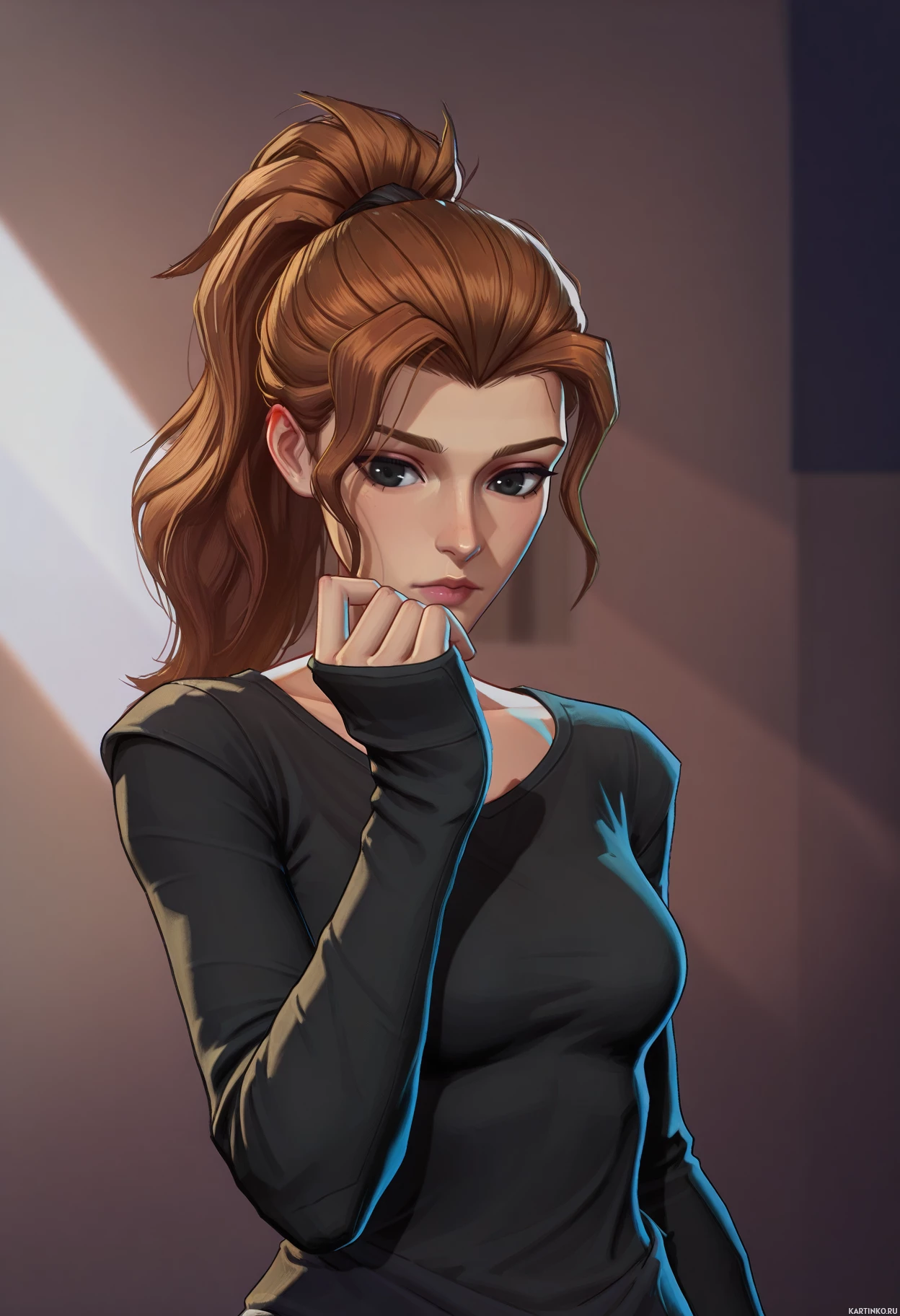 a young woman with long, wavy red hair styled in a ponytail. She is wearing