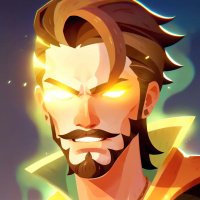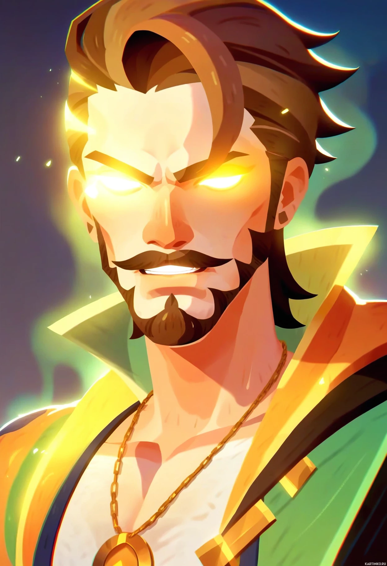 lighting effects around the subject's head. Here are the details of what can be seen in this picture: * **Man** * Brown hair * Mustache * Gold necklace with a circular pendant * **Background** * Dark