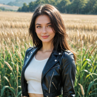 a young woman standing in a field of wheat or barley, posing for the camera. She is wearing a black