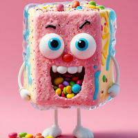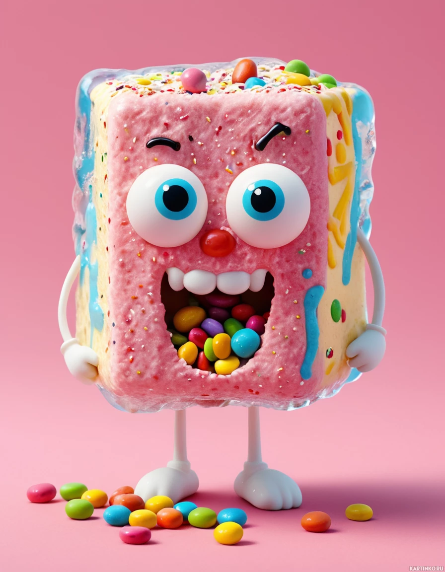 vibrant colors. Overall, the image presents a whimsical and eye-catching depiction of a cake as a character.
