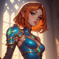 an air of confidence and poise. Her attire is a testament to her elven heritage, featuring intricate details that reflect