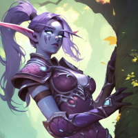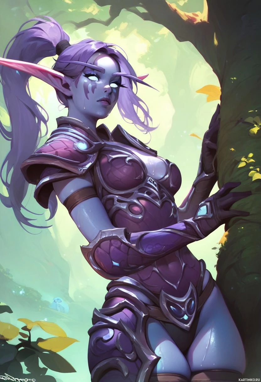 a fantasy character with purple hair, likely a drow or elf, dressed in armor and standing in front of a tree. The character has long, flowing