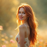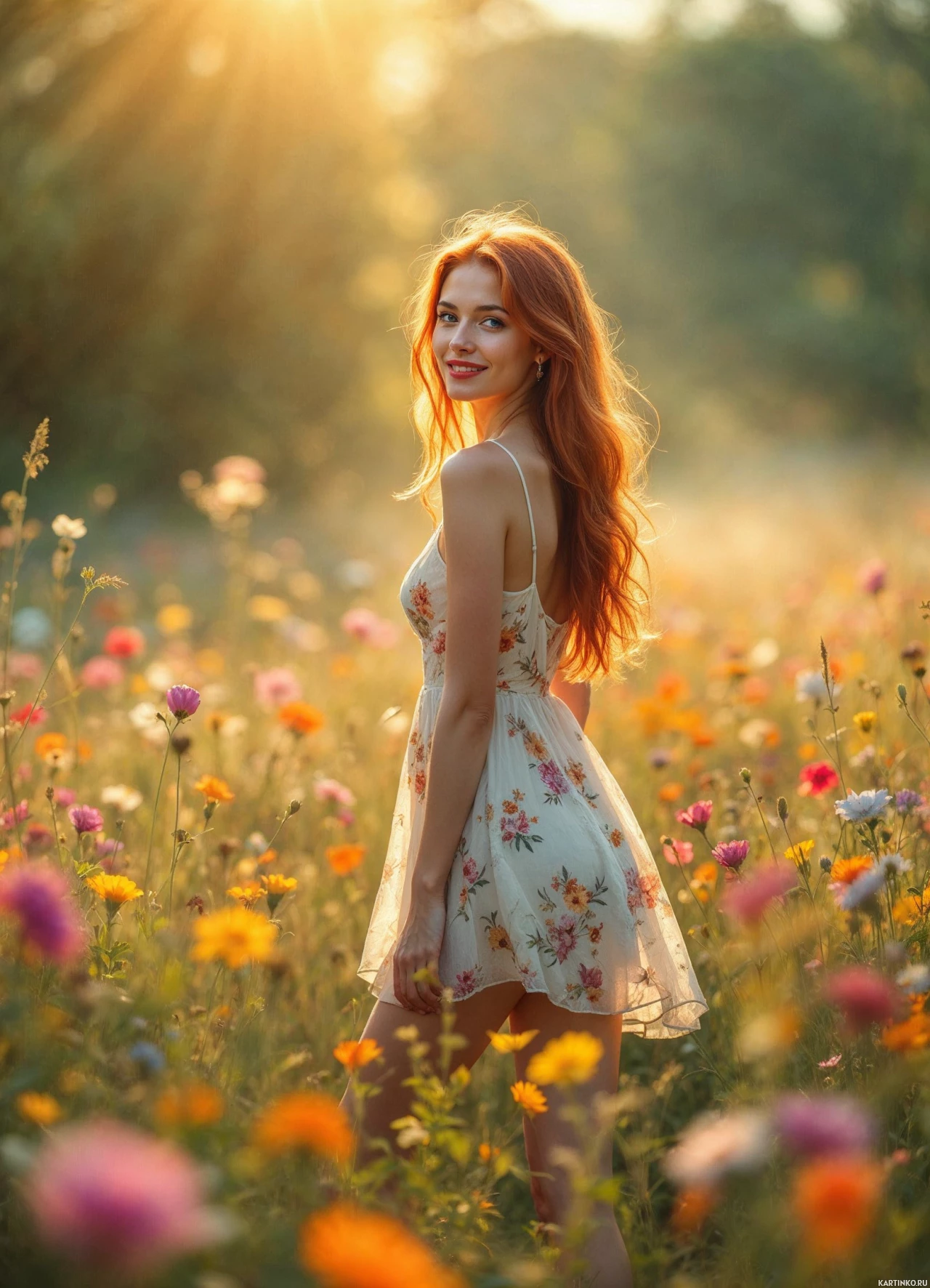 a young woman with long, wavy red hair and a white dress adorned with pink and orange flowers. She is standing in