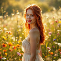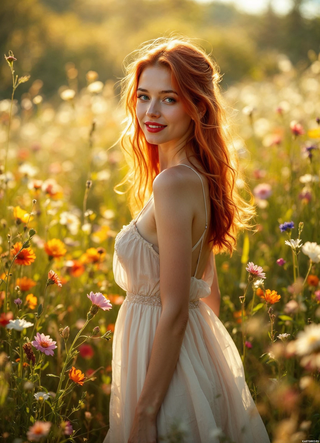 a young woman with long, wavy red hair and a bright smile standing in a field of wildflowers. She is wearing a light-colored dress that falls just above her knees, revealing her