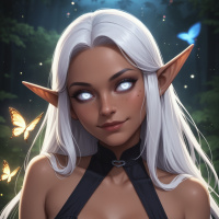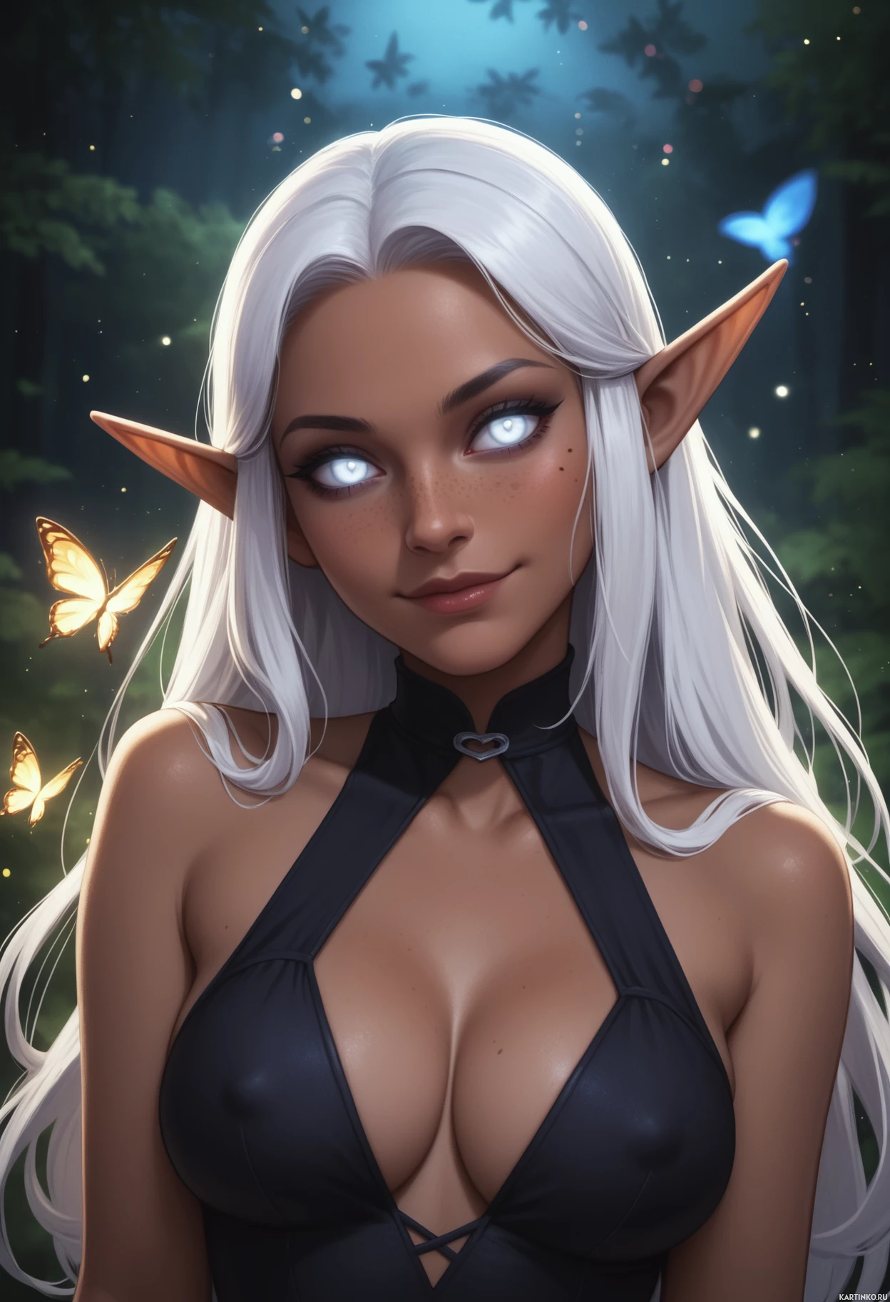 elf woman's skin is smooth and unblemished, with a subtle sheen that suggests a connection to nature. She wears a sleeveless black dress made from a supple material, possibly silk or leather, that clings to her curves in all the right places. The dress features intricate embroidery along the hem and neckline, adding a touch of elegance to its otherwise simple design. The elf woman's pose is confident and relaxed, as if she is accustomed to being admired. Her gaze is directed straight into the camera lens, and her lips are pursed slightly, giving the impression that she is about to speak or reveal a secret. The overall effect is one of ethereal beauty, as if she has stepped out of a dream world and into our own. The background of the image is blurred, but it appears to be a forest glade at dusk. Trees loom in the distance, their branches heavy with leaves that seem to glow in the fading light. Fireflies dance around her head, adding a whimsical touch to the scene. The atmosphere is one of peace and tranquility, as if the elf woman has found solace in this idyllic setting. Overall, the image presents a captivating portrait of an elven woman who embodies both grace and power. Her striking features and elegant attire make her a compelling subject for any fantasy enthusiast or art lover.