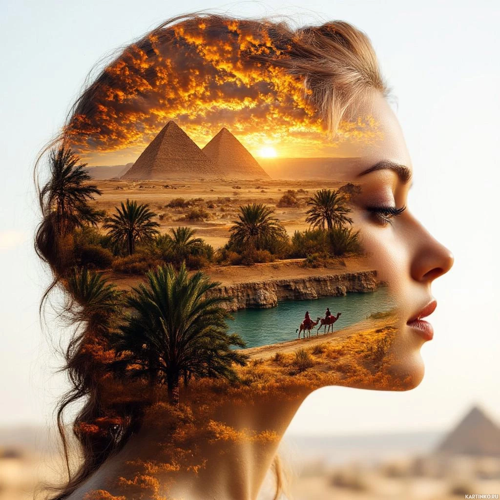 a young woman's profile, with her face and hair seamlessly integrated into an enchanting desert landscape. In the foreground, the woman's fair skin and light