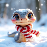 the whimsical atmosphere of the scene. The background is blurred, but appears to be a snowy forest or park setting, complete with trees and other winter scenery. The overall effect of the image is one of playfulness and humor, as if the snake has been brought to life in a fantastical world where it can enjoy the simple pleasures of playing in the snow. The use of bright colors and exaggerated features adds to the lighthearted tone, making the image feel like a delightful winter wonderland adventure.