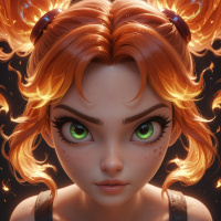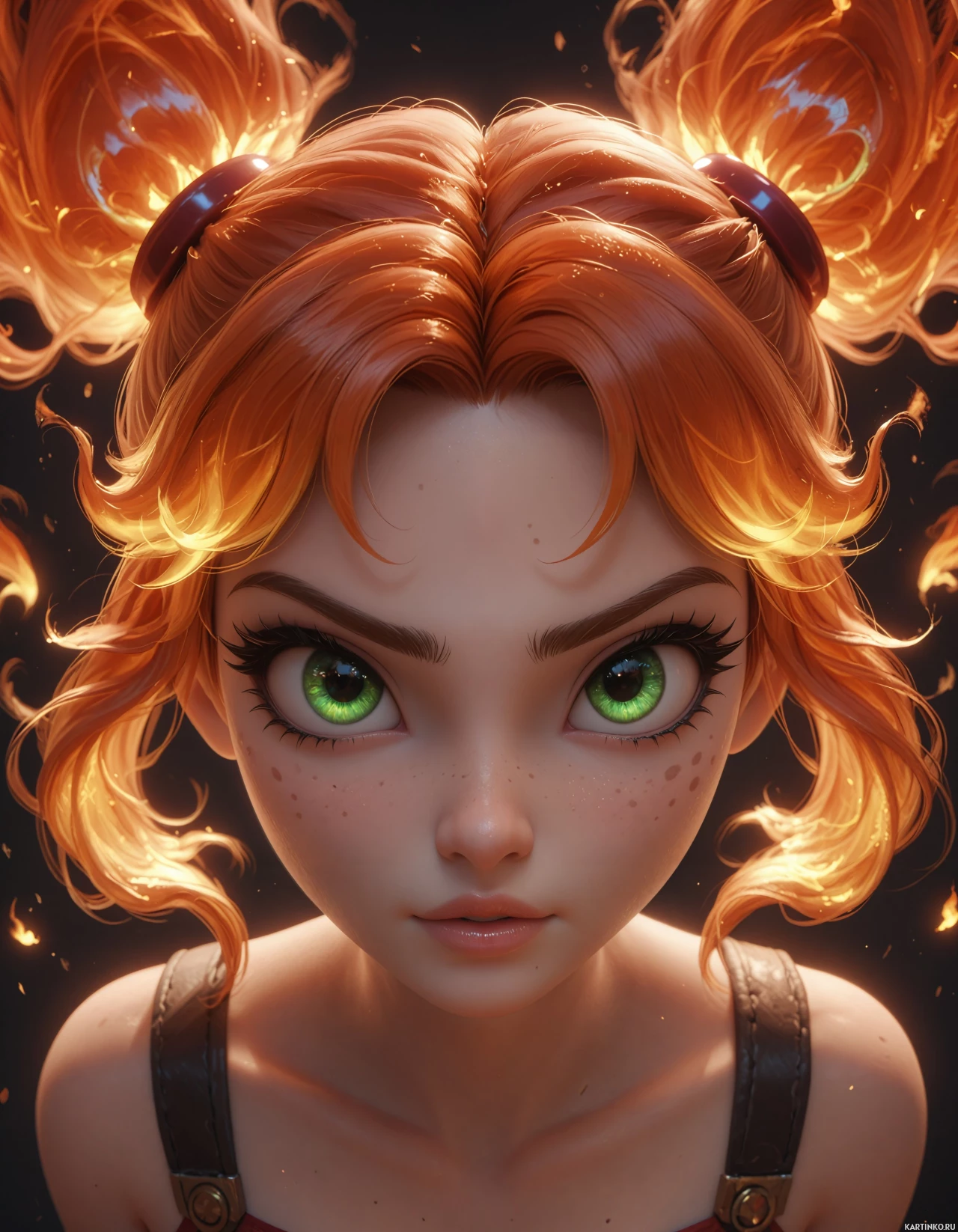 red hair and vibrant green eyes. Her hair is styled in two pigtails, adorned with small bows at the ends. The girl's