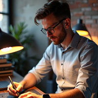 The image depicts a man sitting at a desk, intently focused on his work. He is wearing black-framed glasses and has short