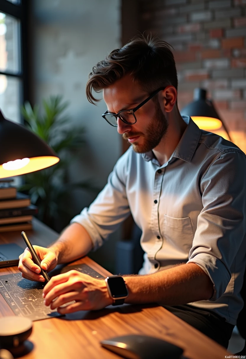 various activities: * One hand grasps a pen, poised over a black mat featuring white circuitry lines. * The other hand rests on the desk, near