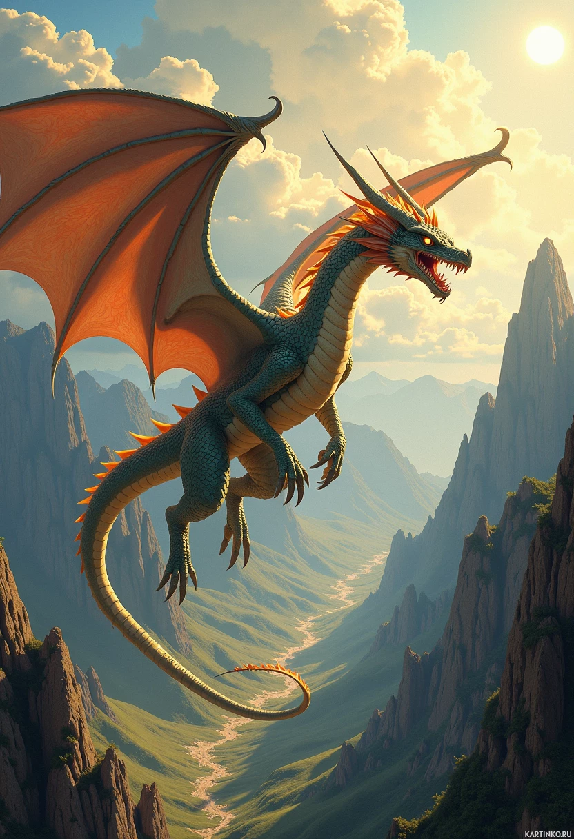 a fantastical scene of a dragon soaring through the sky, set against a backdrop of towering mountains and a cloudy sky. The dragon is prominently featured in the foreground, its body facing to the right as it gazes out at the viewer with