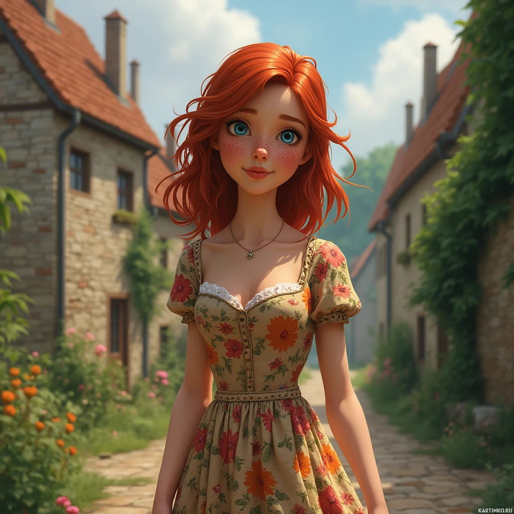 a young woman with striking red hair and blue eyes, dressed in a floral dress. The woman's