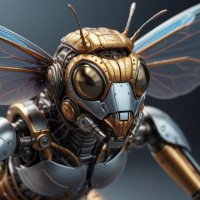 compound eyes and an antenna-like structure that might serve a sensory function, reminiscent of a bee's antennae. The setting is neutral with no background elements to distract from the robot, highlighting its design as the central focus. The image is likely related to