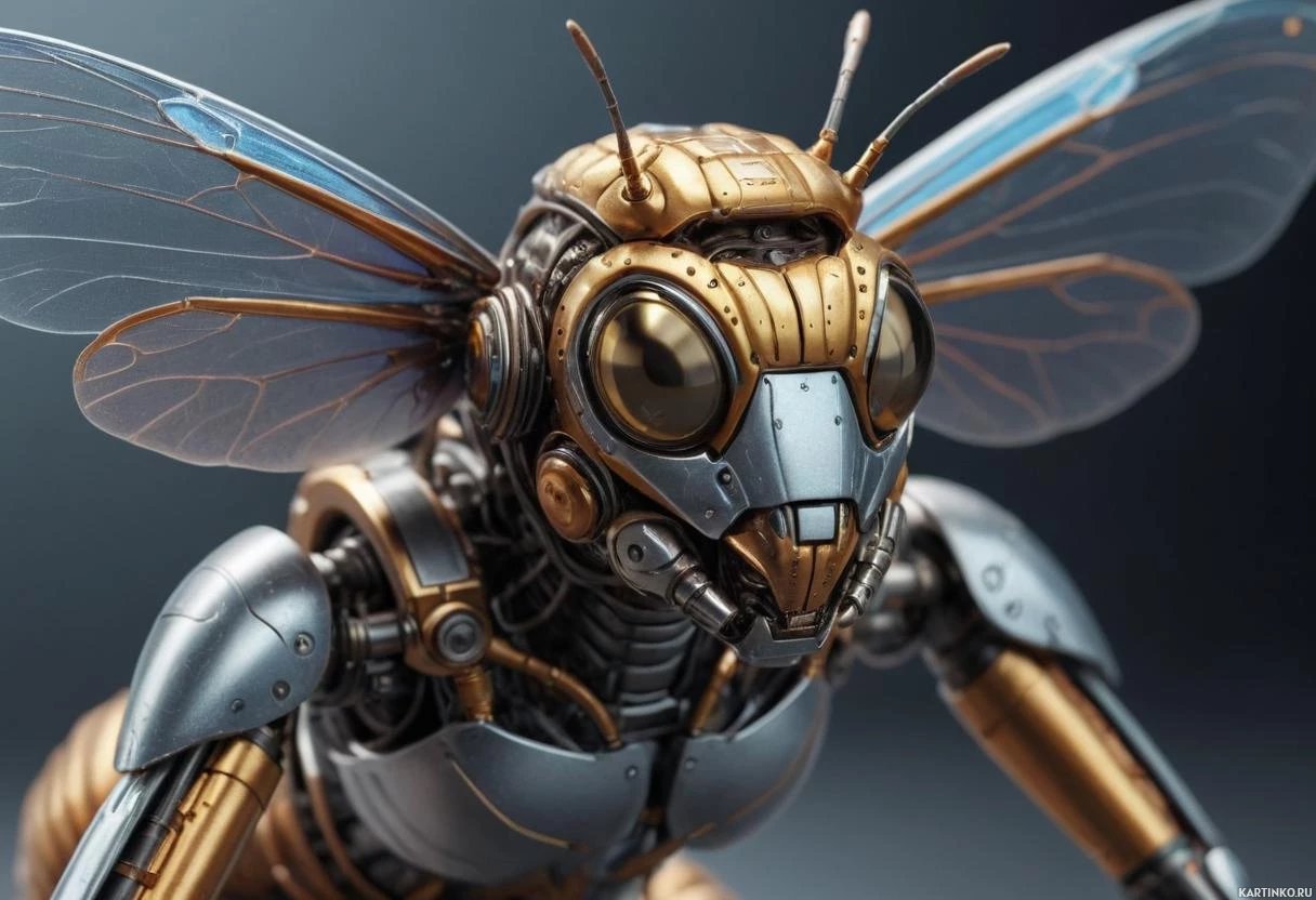 The image features a robot that has been designed with an insect-like appearance. The robot's body and legs are shaped like those of a bee or similar insect, but with a more mechanical and industrial look due to the metal and