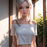 crop top and dark blue jeans, exuding a sense of casual elegance. Her slender figure and toned physique are accentuated by her fitted clothing, while her subtle makeup enhances her