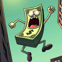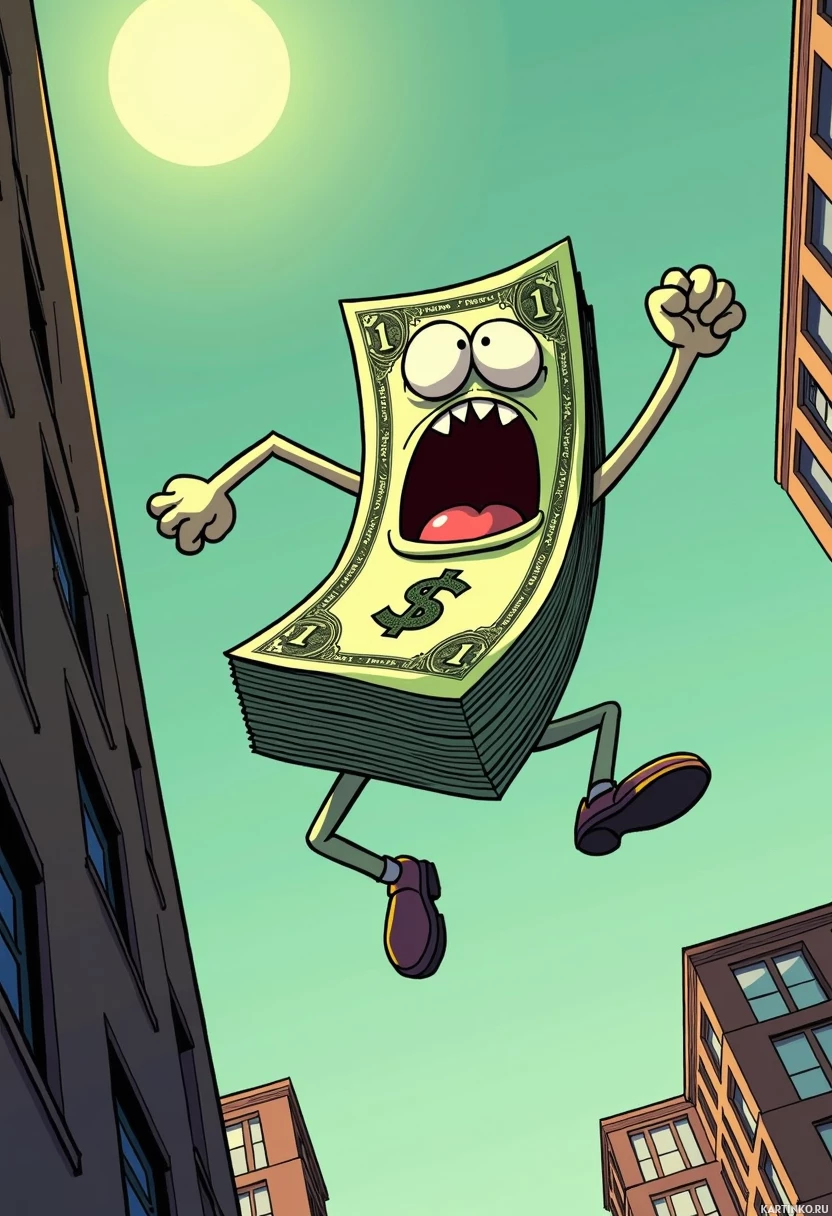 dollar bill in mid-air, suspended between two buildings. The dollar bill is anthropomorphized, with arms and legs, and appears to be screaming or yelling. Its mouth is open wide, revealing