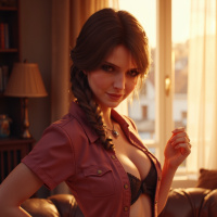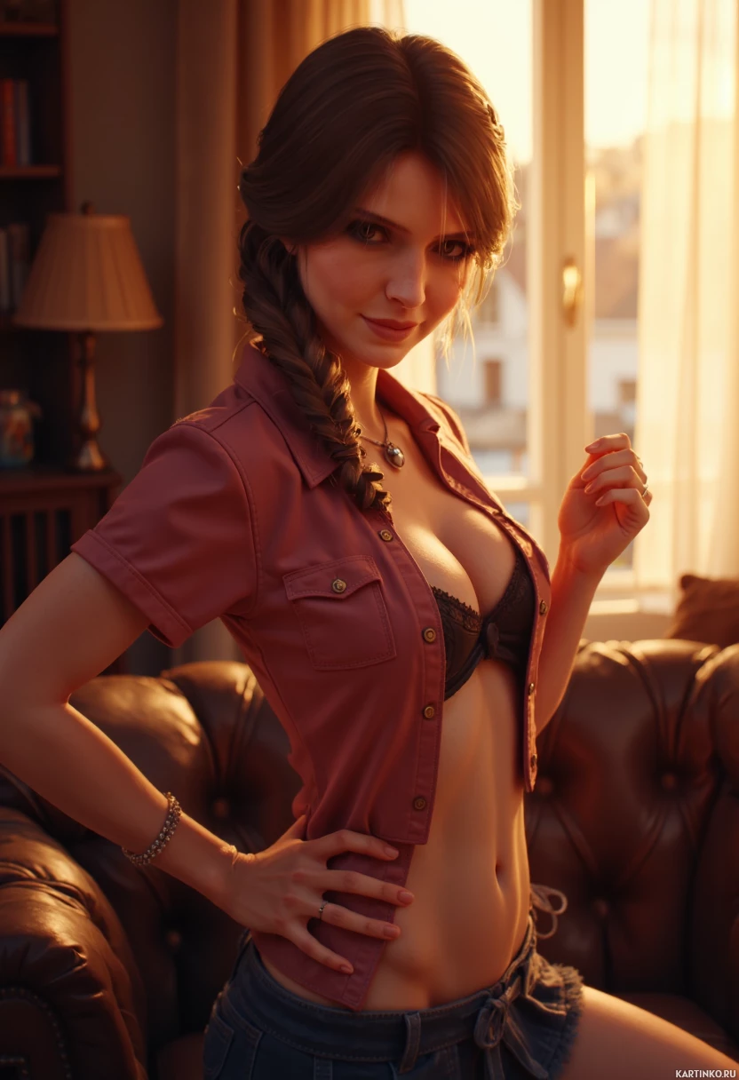 a young woman in her early twenties, posing seductively on a brown leather couch. She is dressed in a maroon button-up shirt with two pockets on the chest that are unbuttoned, revealing a black lacy