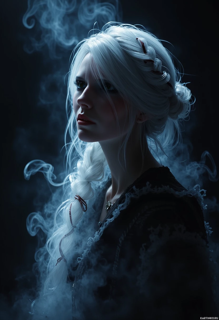 white dress with intricate lace details at the neckline. The dress appears to be made of a lightweight material, such as silk or chiffon, and is draped elegantly around her body. In the background, the dark tones create a sense of mystery and intrigue, drawing the viewer's attention to the woman's enigmatic expression. The overall effect is one of ethereal beauty and serenity, inviting the viewer to ponder the story behind this captivating image.