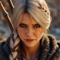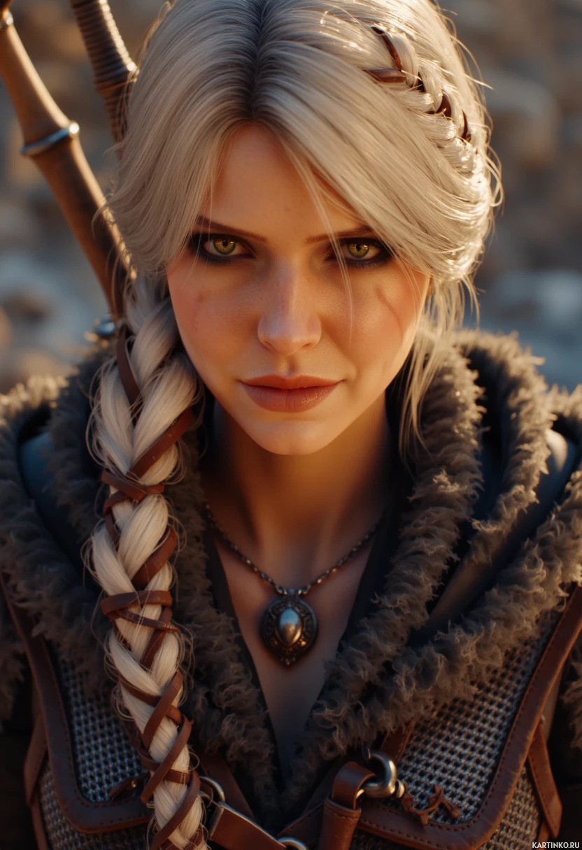 the fantasy world of the game, while the sword on her back implies a sense of danger and adventure. Overall, the image presents a strong and confident female character, likely from the popular video game series "The Witcher". The woman's attire and accessories evoke a sense of fantasy and adventure, making her an intriguing and captivating figure.