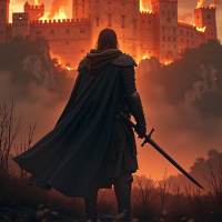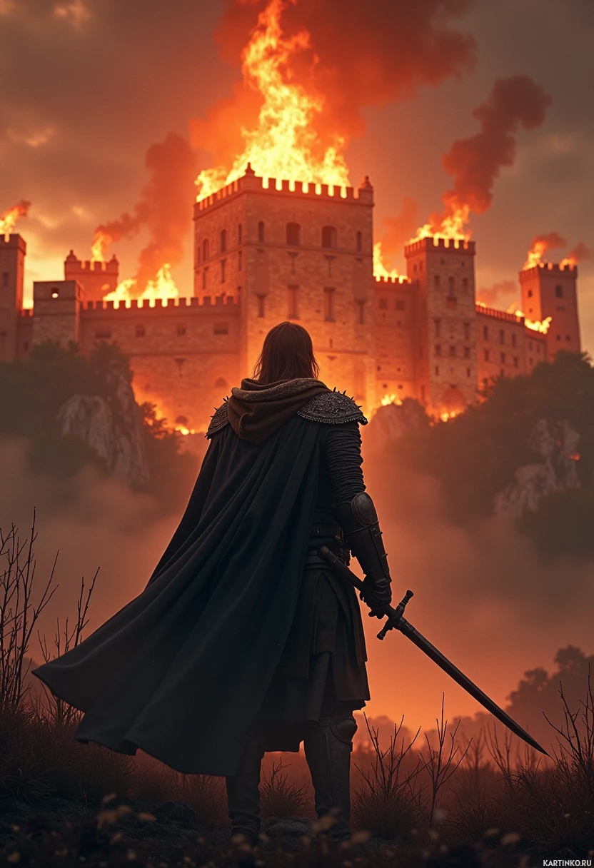 Dark clouds The image conveys a sense of destruction and chaos, with the burning castle serving as a backdrop for the warrior's contemplative stance.
