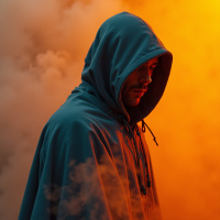 the dramatic effect of the scene. Overall, the image presents a striking and enigmatic figure, shrouded in mystery and obscurity. The use of smoke or fog as a backdrop adds to the sense of drama and tension, making the image feel both haunting and captivating.