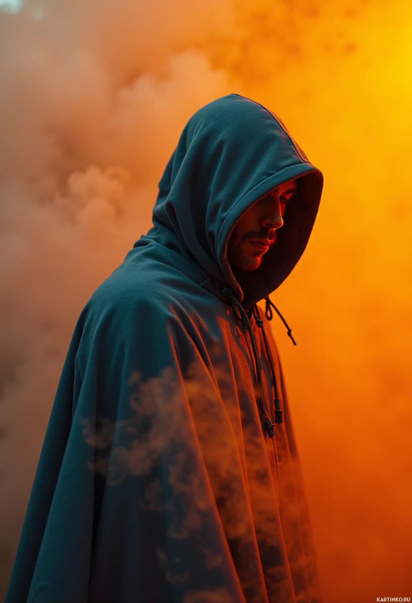 heavy material, possibly wool or fleece. The cloak is draped over his shoulders, covering most of his upper body, and features a hood that is pulled up over his head, concealing his face from view. The hood is slightly angled, giving the impression that the man is looking down or to the side. The background of the image is dominated by smoke or fog, which adds to