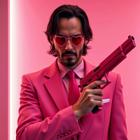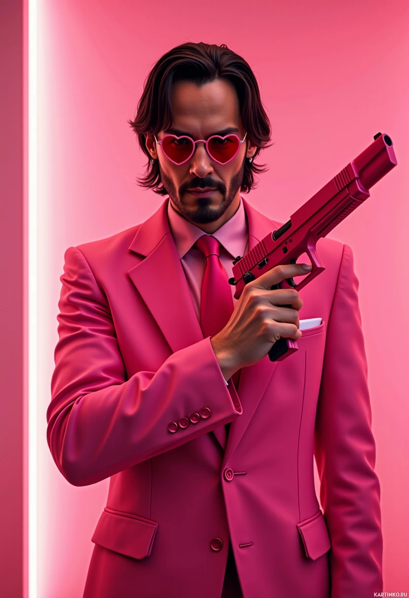 a pink suit, holding a pistol and wearing heart-shaped sunglasses. The man has