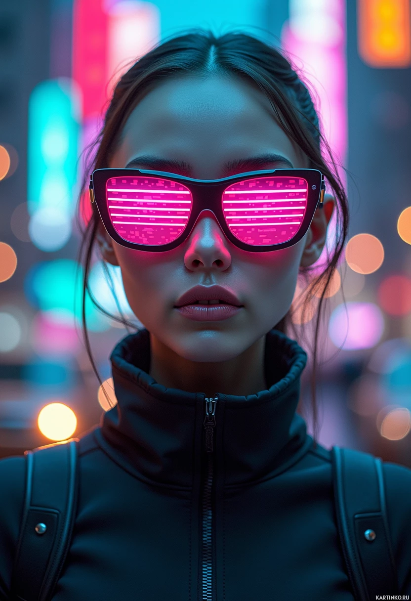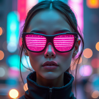 urban environment at night. The atmosphere is moody and atmospheric, with a hint of neon glow emanating from the glasses and the surrounding area. Overall, the image presents a captivating portrait of a young woman, with the sunglasses serving as a symbol of her individuality and style.
