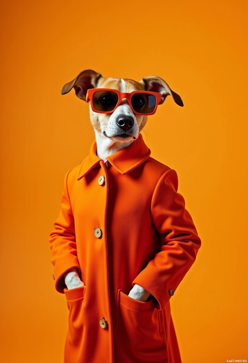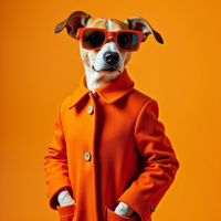 The image shows a dog wearing sunglasses and an orange coat. It appears to be anthropomorphized, giving the dog human-like qualities such as standing upright and wearing clothing. The background is yellow and gray, providing a contrasting backdrop to the dog's outfit.