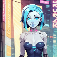 The image features a female character with blue hair styled in a bob haircut. She has a stylized appearance, resembling that of an animated or video game character rather than a real person. Her face is drawn with exaggerated features like large expressive eyes and a slight frown. She is wearing a skin-tight black bodysuit that appears to have a futuristic design. The suit has metallic detailing, suggesting that she may be a robot or android. There are visible lines on the torso of the suit that could be interpreted as circuitry or a power source. The background is dark and moody with neon lights giving off an electric glow, contributing to the science fiction ambiance of the image. The architecture hints at a cyberpunk setting, possibly a dystopian cityscape. There are signs hanging on the wall that appear to be written in non-English characters. The overall mood of the image is edgy and intense, fitting within the science fiction genre.