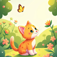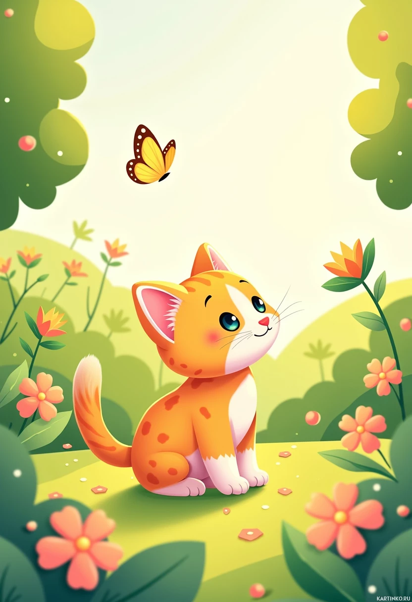 a serene scene featuring a cat, flowers, and a butterfly. The cat is orange with white paws and chest, sitting on a green surface surrounded by