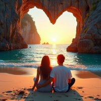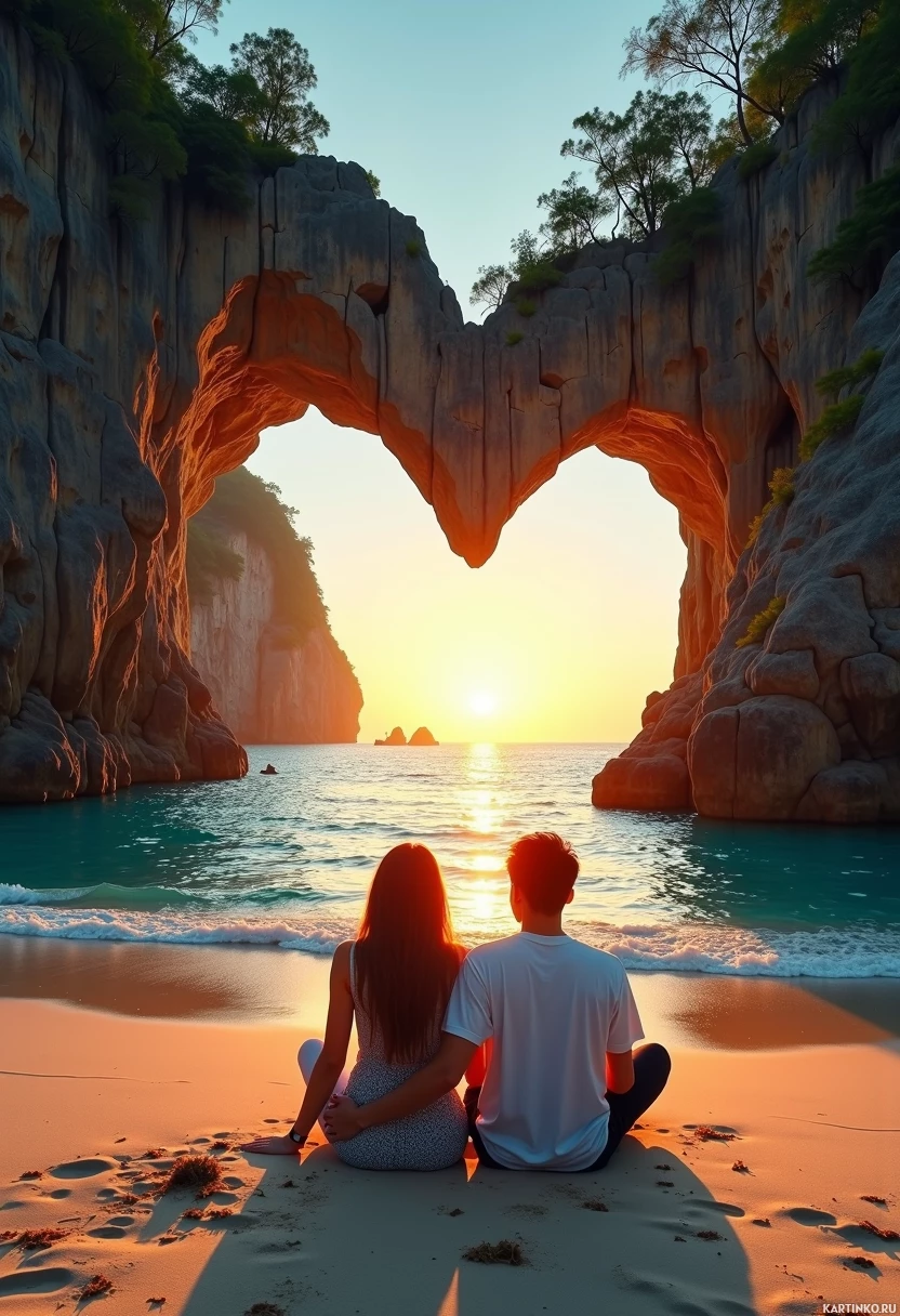 body language suggests they are deeply connected and enjoying each other's company. In the background, the sun sets over the horizon, casting a warm