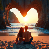 gentle waves lapping at the shore. * The sand is soft and inviting, providing a comfortable surface for the couple to sit on. * **Natural Archway** * Behind the couple stands an impressive natural archway, its entrance forming