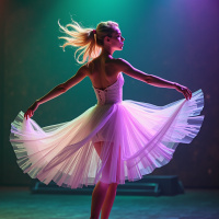 blonde hair, dressed in a white dress and ballet shoes, dancing on stage. She is wearing