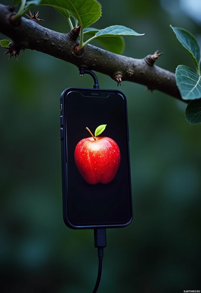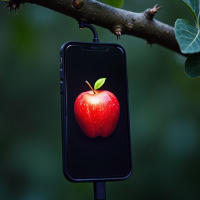 a natural setting, possibly outdoors or in a garden. Here are the details of what can be seen in this picture: * A smartphone: * The phone is hanging from an apple tree branch. * It has a black casing and a red apple displayed on its screen. * The phone is connected to