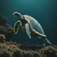На картинке запечатлена подводная сцена, в центре которой – морская черепаха. Она высовывает голову из воды, создавая впечатление спокойствия и наблюдательности. Кажется, черепаха либо плывет, либо дрейфует на поверхности океана. Вокруг — коралловый риф, типичное место обитания морских черепах. Свет, проникающий сквозь воду, создает красивый контраст с глубоким синим цветом моря.