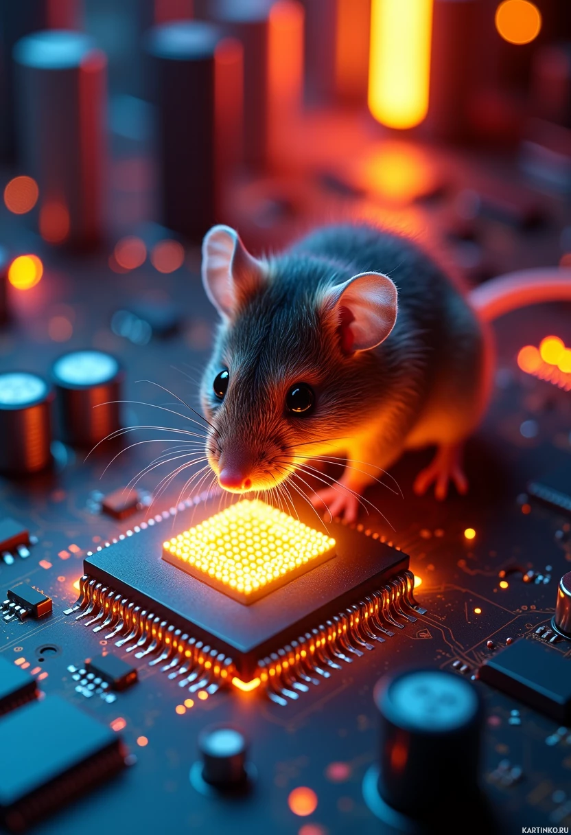 The image depicts a mouse standing on an electronic circuit board, surrounded by