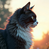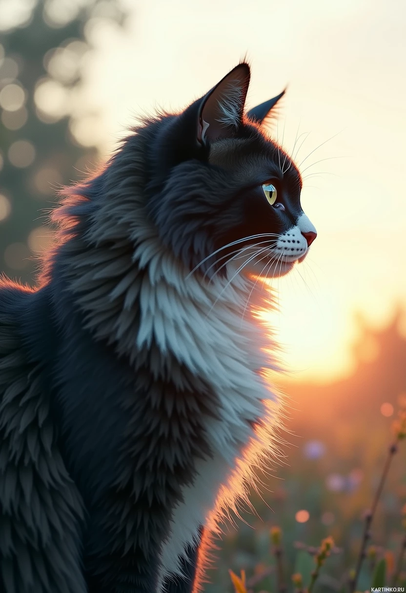 a serene scene of a black and white cat gazing out at the horizon, its head turned to the right. The cat's fur is long and fluffy, with a distinctive