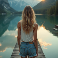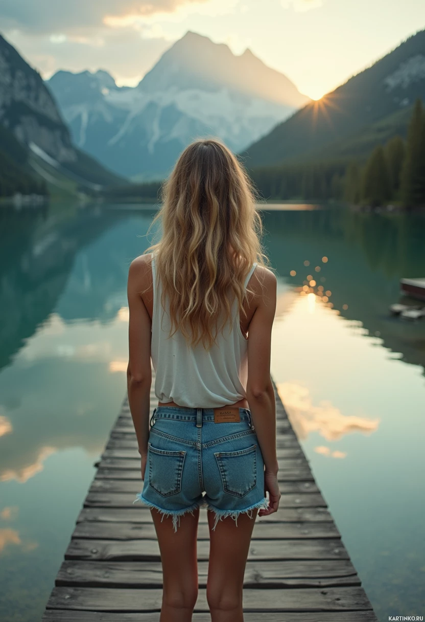 a young woman with long, wavy blonde hair wearing a white tank top and denim shorts standing on a wooden dock overlooking a serene body of water. The woman's back is to the camera, and she is facing away from it. In the background, there are mountains visible in the distance, suggesting that the scene is set in a natural or outdoor setting. The overall atmosphere of the image appears to be peaceful and contemplative, with the woman seemingly lost in thought as she gazes out at the water. The use of warm colors and