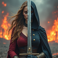 the presence of the sword suggest that she may be a warrior or a fighter, possibly fighting against an enemy or protecting her people from harm. Overall, the image conveys