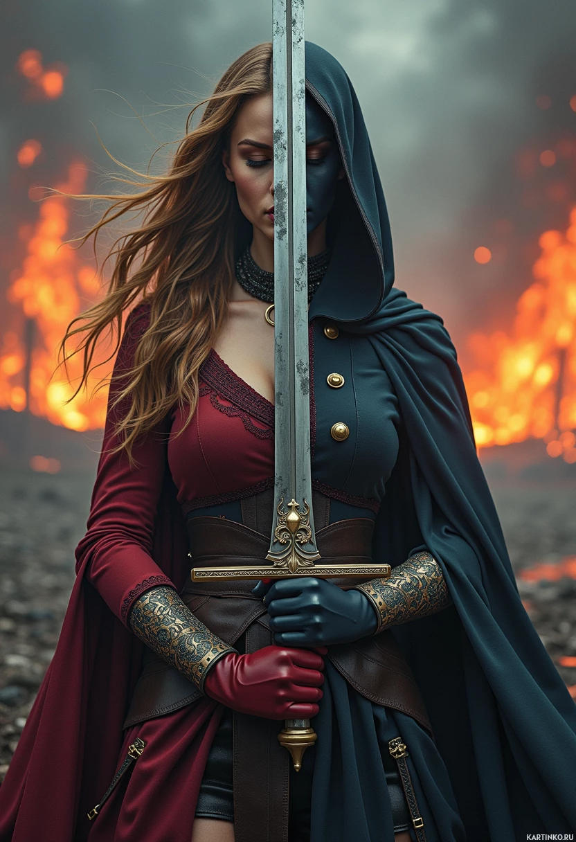 a red dress and cloak. She is holding a sword in her right hand, with her left arm resting on the hilt. Her hair is loose and flowing in the wind, and she has closed eyes. In the background, flames are visible, suggesting that the scene may be set in a post-apocalyptic or fantasy world. The woman's attire and