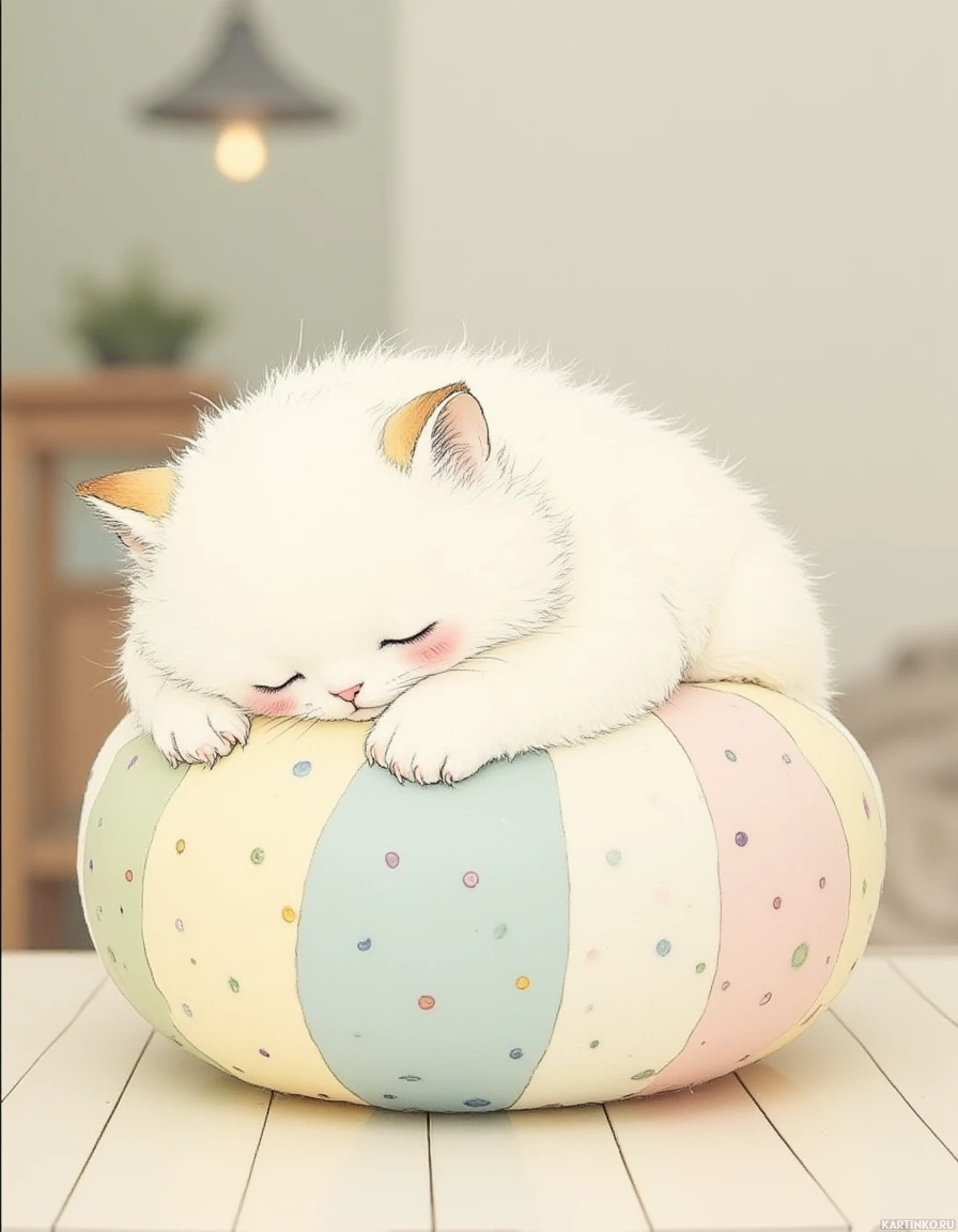 wooden table. The egg is striped with pastel colors in various shades, adding a playful touch to the scene. Although the egg appears to be made of fabric or paper mache, its surface is smooth and rounded, giving it a soft, plush appearance. In the background, there is a blurred room that adds depth to the image without distracting from the main subject. The overall atmosphere of the scene exudes warmth and coziness, evoking feelings of relaxation and contentment.
