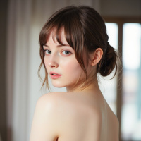 a young woman with brown hair, styled in an updo, showcasing her elegant attire and poised demeanor. In this portrait, the subject is captured from behind, gazing over her shoulder at the viewer, exuding confidence and poise as she strikes a pose in front of