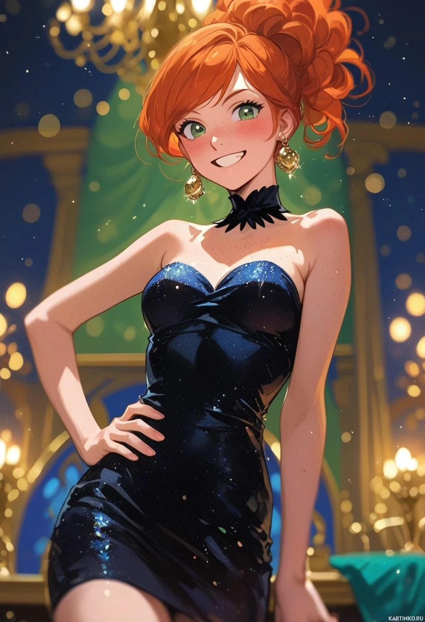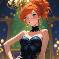 female character with red hair, wearing a black dress adorned with blue sequins. She has