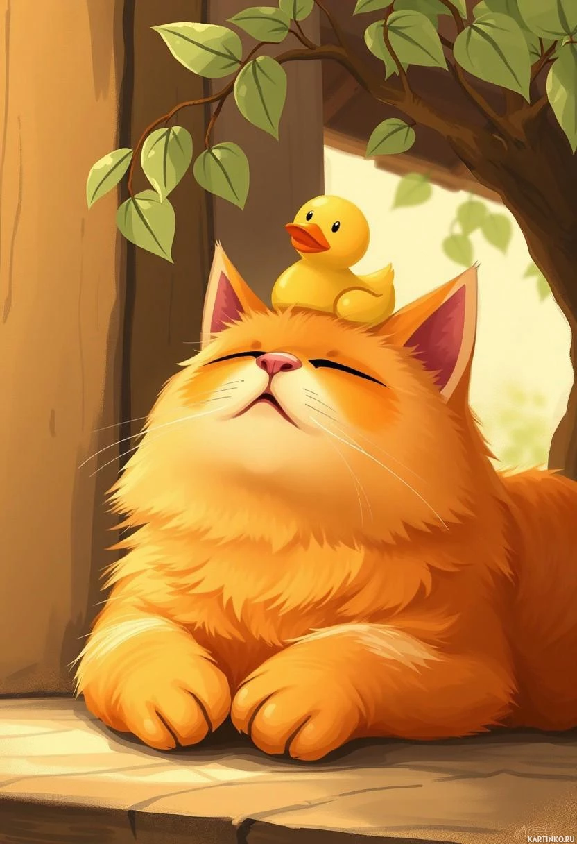 rubber duck, which is likely being used as a pillow by the cat. The setting appears to be outdoors during daylight, possibly near a window or doorway that provides