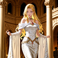 blonde hair and is wearing a long, elegant dress with intricate designs, suggesting a theme of luxury or nobility. The setting is opulent and resembles